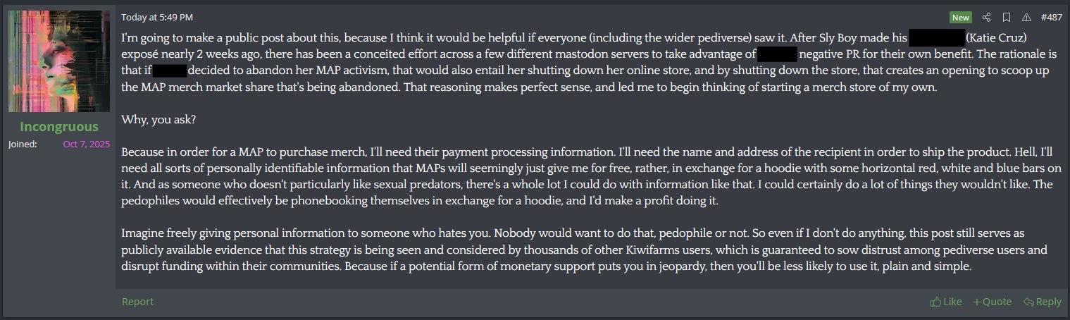 Screenshot from Kiwi Farms: I'm going to make a public post about this, because I think it would be helpful if everyone (including the wider pediverse) saw it. After Sly Boy made his (Katie Cruz) exposé nearly 2 weeks ago, there has been a conceited effort across a few different mastodon servers to take advantage of negative PR for their own benefit. The rationale is that if Katie decided to abandon her MAP activism, that would also entail her shutting down her online store, and by shutting down the store, that creates an opening to scoop up the MAP merch market share that's being abandoned. That reasoning makes perfect sense, and led me to begin thinking of starting a merch store of my own. Why, you ask? Because in order for a MAP to purchase merch, I'll need their payment processing information. I'll need the name and address of the recipient in order to ship the product. Hell, I'll need all sorts of personally identifiable information that MAPs will seemingly just give me for free, rather, in exchange for a hoodie with some horizontal red, white and blue bars on it. And as someone who doesn't particularly like sexual predators, there's a whole lot I could do with information like that. I could certainly do a lot of things they wouldn't like. The pedophiles would effectively be phonebooking themselves in exchange for a hoodie, and I'd make a profit doing it. Imagine freely giving personal information to someone who hates you. Nobody would want to do that, pedophile or not. So even if I don't do anything, this post still serves as publicly available evidence that this strategy is being seen and considered by thousands of other Kiwifarms users, which is guaranteed to sow distrust among pediverse users and disrupt funding within their communities. Because if a potential form of monetary support puts you in jeopardy, then you'll be less likely to use it, plain and simple.